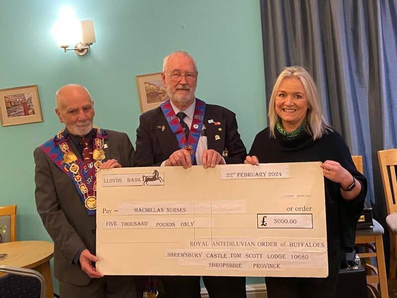£5000 raised by the 2023 Provincial Grand Primo, Brother Richard Shellard ROH, was presented to Macmillan Nurses by the Grand Primo, Brother John Brogan ROH, the current Provincial Grand Primo, Brother Frank Maddocks ROH, and received by Kate Thomas, Relationship Fundraising Manager for Macmillan Cancer Support who was accompanied by Carole Green, Treasurer, Shrewsbury Group.